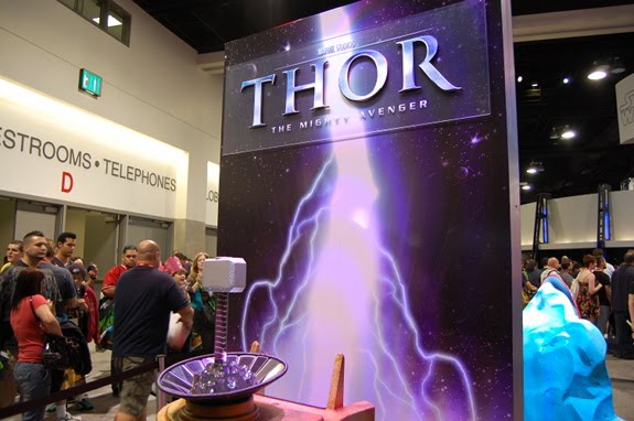 Replika palu besar Mjolner milik Thor dipamerkan bersebelahan dengan banner Captain America